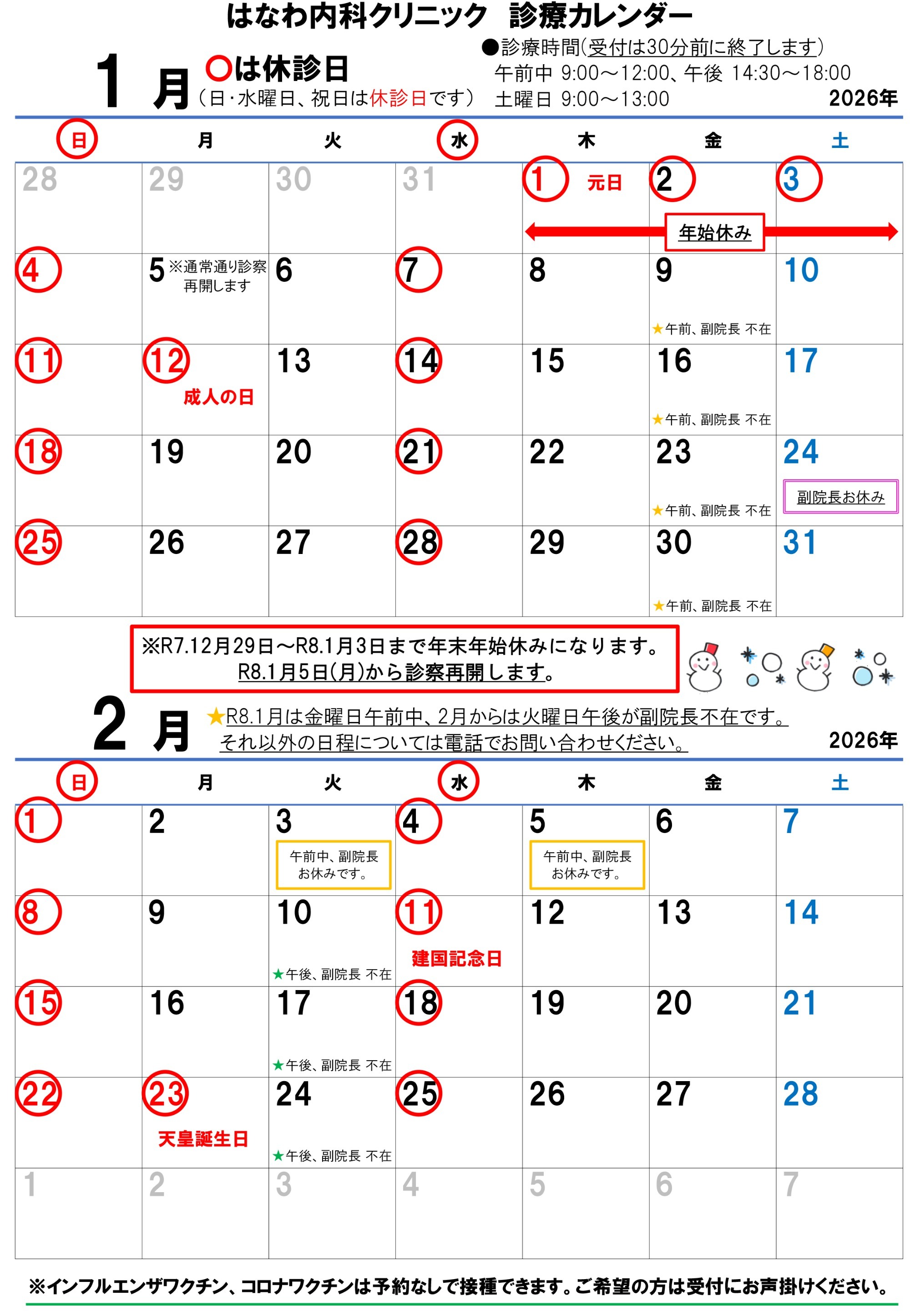 R7.1月10日(金)、14日(火)の午後は副院長不在です。待ち時間が長くなるかもしれません。